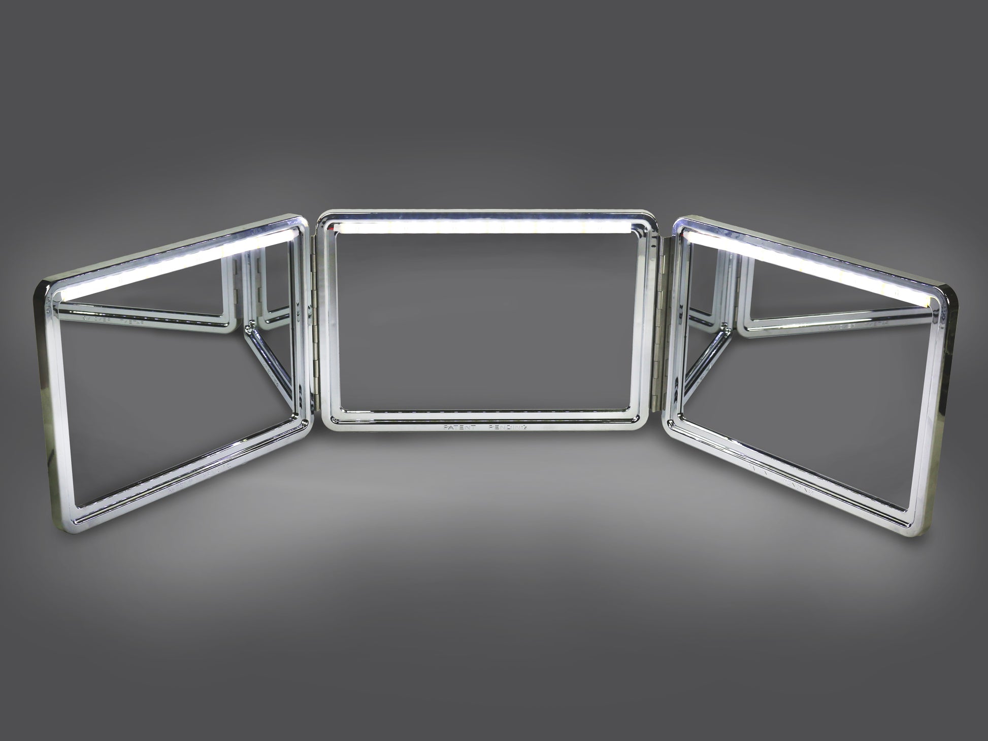 The Self-Cut System 2.0 Heaven Lights is a three-way mirror system equipped with built-in high-quality LED lights. It allows users to see every angle of their head, facilitating precise self-haircuts. The system is designed for portability and convenience.
